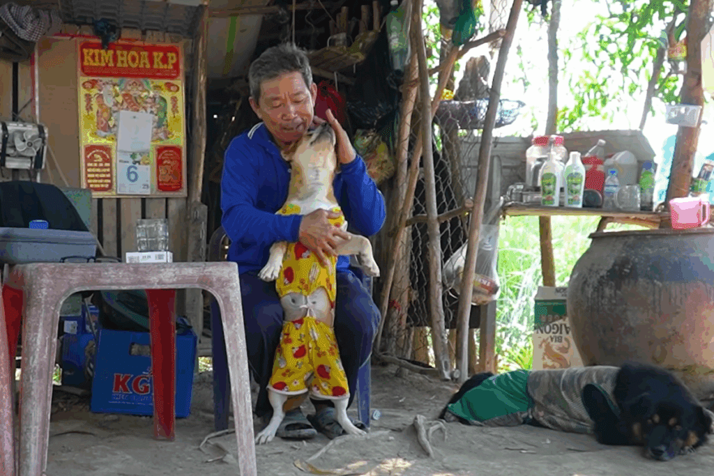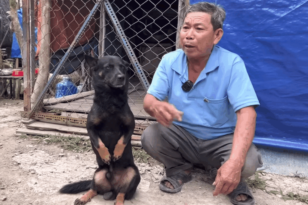 Điều kiện sinh hoạt còn chật vật: ông dựng một chòi lá nép dưới bóng cây bên bờ kênh, dùng tấm cao su làm vách che nắng mưa—vừa là nhà, vừa là “trụ sở” của đội trợ lý bốn chân. Bù lại, “các cháu” rất hiểu ý chủ nhờ được dạy dỗ hằng ngày. “Kêu gì làm nấy, ngoan lắm”, ông cười hiền.