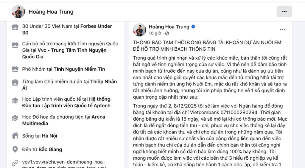 Trong thông báo được đăng tải công khai trên trang Facebook cá nhân, ông Trung nêu rõ: Trong ngày thứ 2, 8-12-2025, tôi sẽ làm việc với Ngân hàng để đóng băng tài khoản tại địa chỉ Vietcombank 0711000280294. Thời gian đóng băng dự kiến là 15 ngày, và sẽ mở lại khi có thông báo mới. Mục đích là để ngắt dòng tiền thu – chi, phục vụ cho việc thống kê lại đầy đủ tất cả các khoản thu và chi cho dự án trong những năm qua. Tôi nhận được rất nhiều sự chất vấn của cộng đồng liên quan đến việc minh bạch thu chi của dự án dẫn đến chính bản thân tôi cũng nghi ngờ không biết mình có đảm bảo làm đúng 100% hay không. Tôi mong muốn được làm việc với các bên thứ 3 hiểu rõ nghiệp vụ kế toán – kiểm kê, có khả năng tiến hành 1 cách độc lập, để kiểm tra 1 cách khách quan nhất nghiệp vụ thu tiền – chi tiền của dự án Nuôi Em trong suốt những năm qua”.