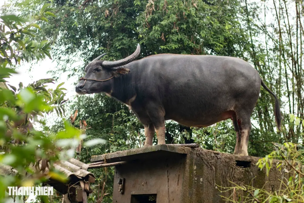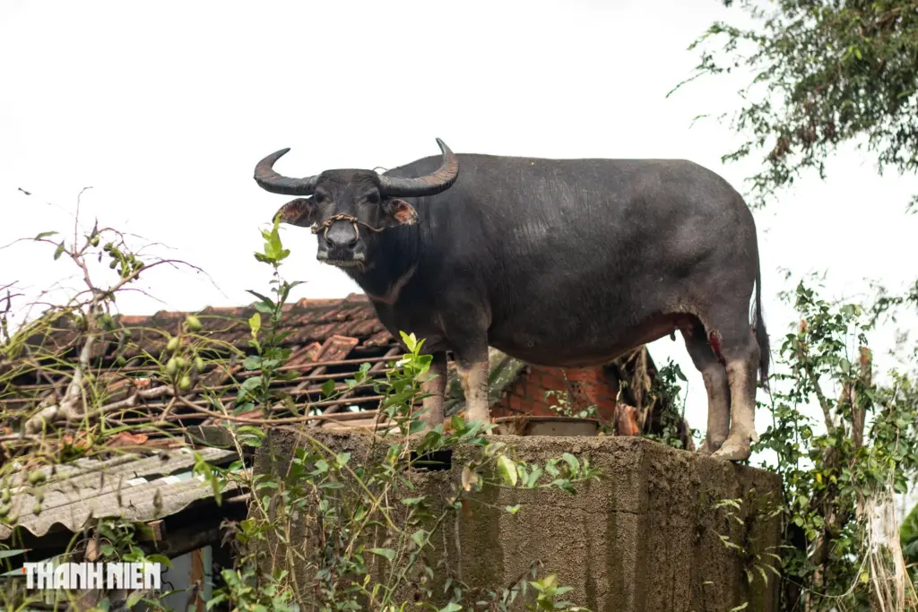 Theo anh Vũ, khi nước lũ dâng cao, con trâu này từ nơi khác trôi dạt đến nhà mẹ anh. Sau đó, nó bám víu vào một số nơi và leo lên mái nhà vệ sinh ở góc trái của căn nhà. Nhờ có mái nhà vệ sinh chắc chắn nên con trâu tránh được đợt lũ kinh hoàng vừa qua.
