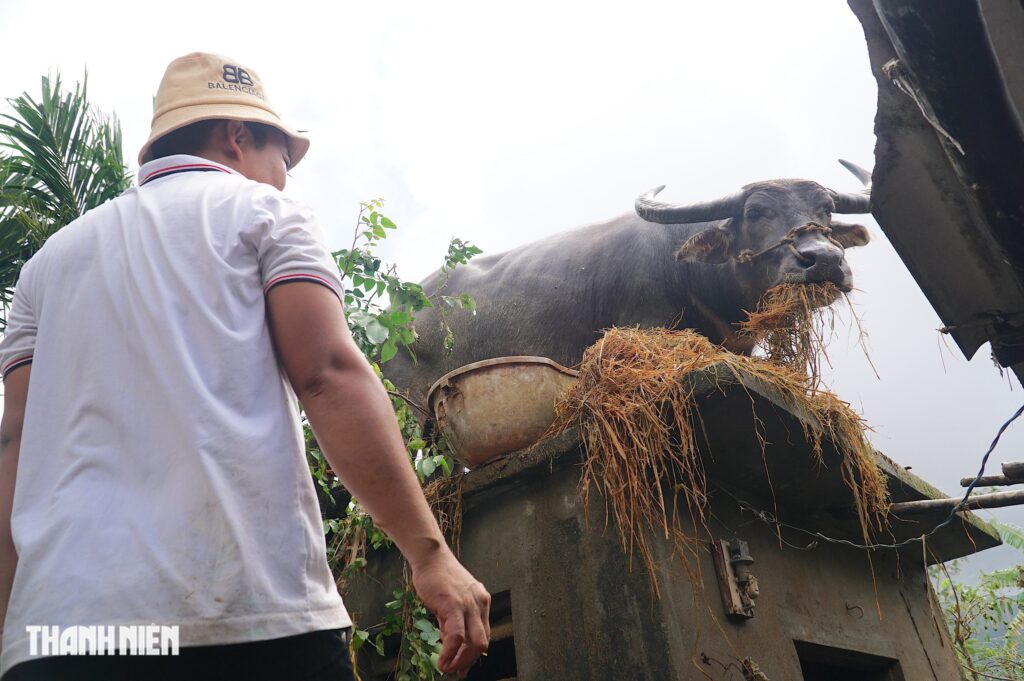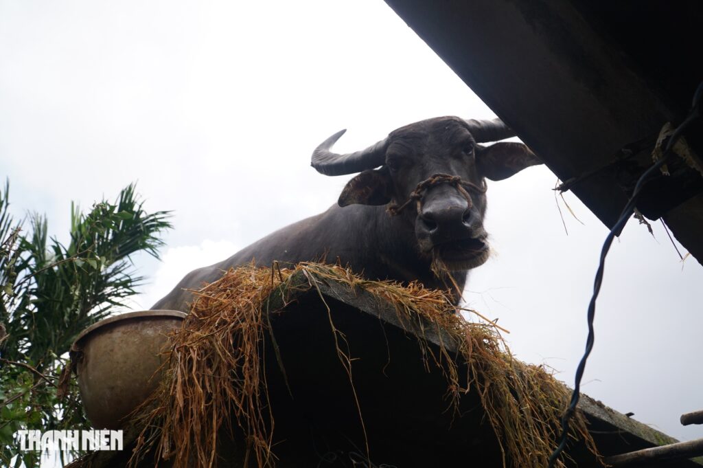 Anh Vũ cho biết con trâu đứng suốt 5 ngày nay và có thể đã nhịn ăn 3 ngày trước đó trong thời điểm lũ lụt hoành hành. Sau khi nước rút, sẵn nhà có rơm khô, anh và mẹ thay nhau cho ăn mỗi sáng, kèm cho uống nước liên tục để con trâu duy trì sức lực.