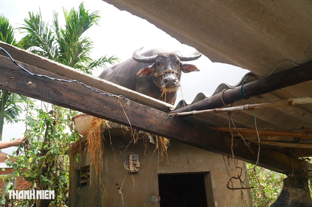 “Đây là con trâu cái, mấy ngày nay về nhà mẹ để dọn dẹp giúp mẹ sau lũ, thấy tôi là nó lại kêu, mẹ tôi thấy con trâu đáng thương nên đi đâu gặp đội cứu hộ, chính quyền địa phương cũng nài nỉ mọi người tìm cách cứu con trâu. Nhưng mà, các anh đang bận giúp người dân nên chưa đến để mang con trâu xuống đất được”, anh Vũ chia sẻ.
