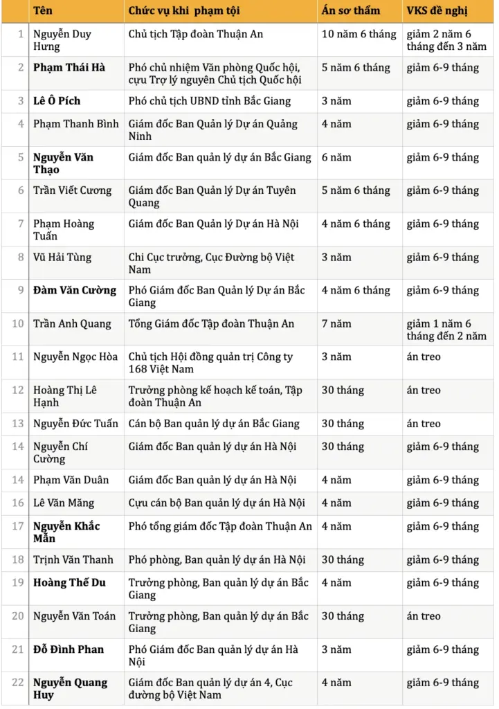 *Những người có tên in đậm là bị cáo không kháng cáo song vẫn được đề nghị giảm án