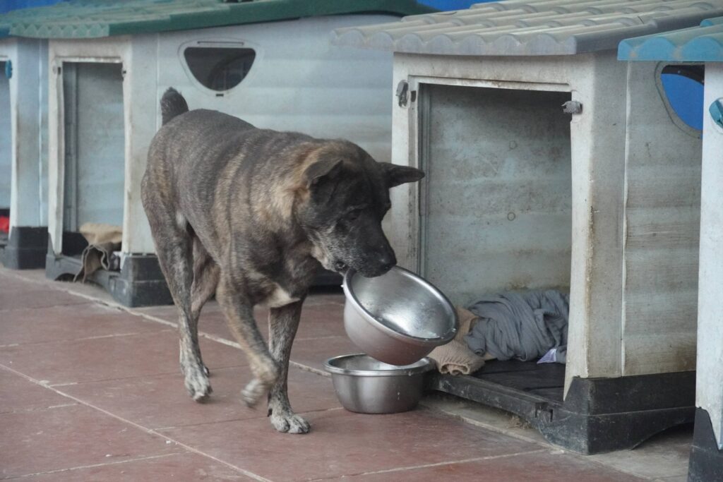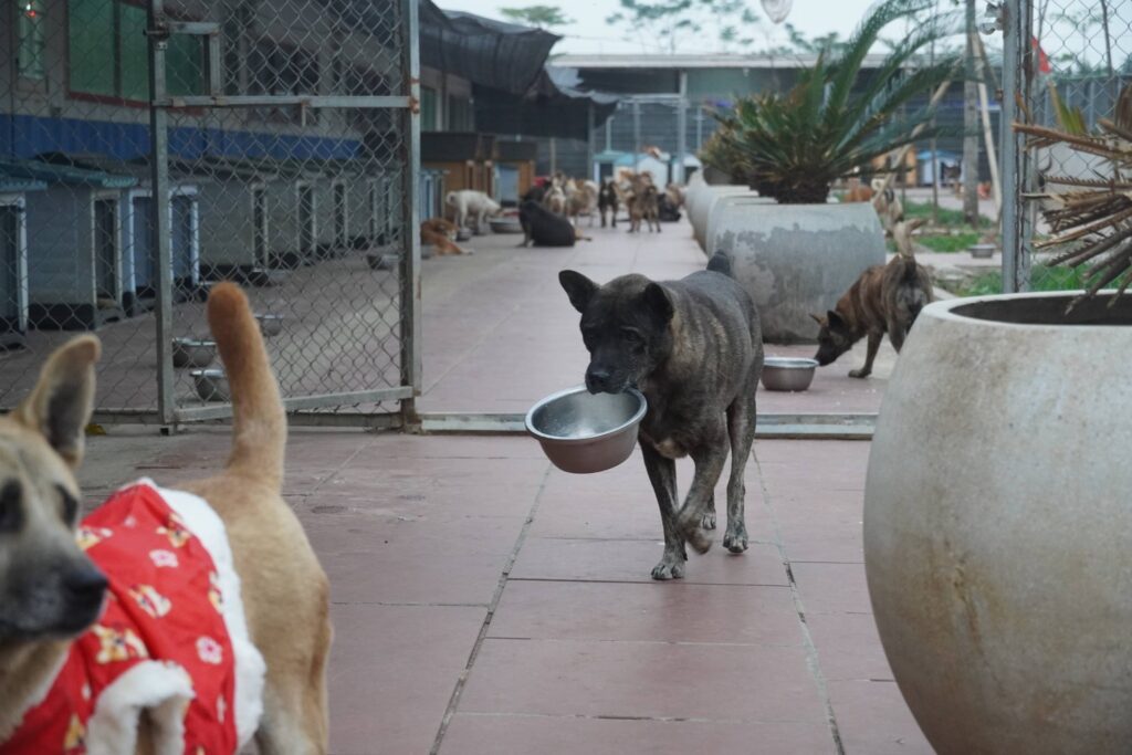 Cứ ăn xong là Vện Cộc lại cầm theo chiếc bát của mình đi khắp nơi trong Sân, đôi khi em ấy giấu thât kỹ trong ngôi nhà của mình.