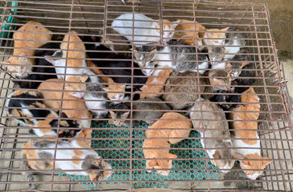 Công an kiểm tra đột xuất căn nhà thuê ở xã Phước Dinh, phát hiện hàng chục con mèo đang bị nhốt trong lồng sắt, bao tải.