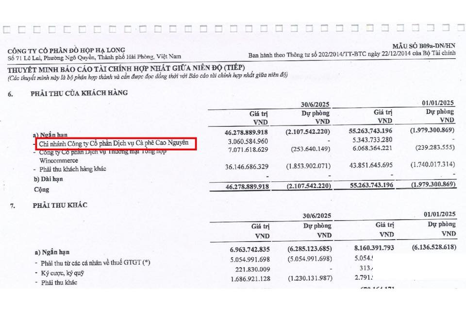 Ngay sau khi thông tin vụ việc được công bố, giới đầu tư và người tiêu dùng đã nhanh chóng tìm lại Báo cáo tài chính hợp nhất bán niên năm 2025 của Công ty Cổ phần Đồ hộp Hạ Long (được công bố ngày 30/08/2025). Dữ liệu tại trang 20, mục Thuyết minh báo cáo tài chính hợp nhất giữa niên độ số 6 về Phải thu ngắn hạn khách hàng, ghi nhận Công ty Cổ phần Dịch vụ Cà phê Cao Nguyên (đơn vị chủ quản thương hiệu Highlands Coffee) là một trong những khách hàng có giao dịch thường xuyên và công nợ lớn với Đồ hộp Hạ Long.