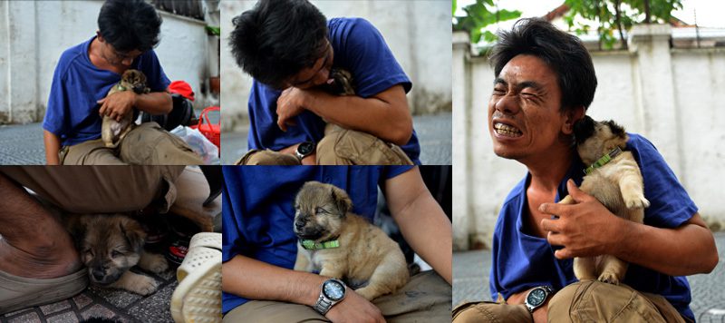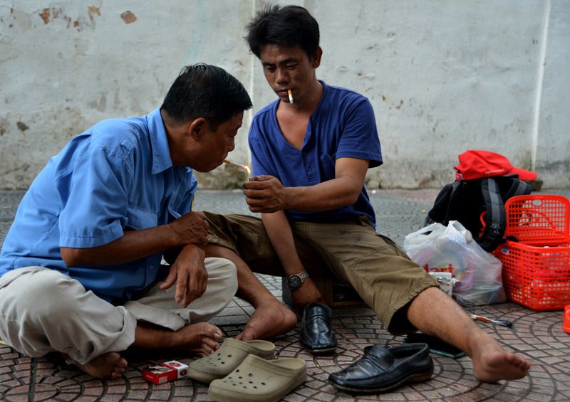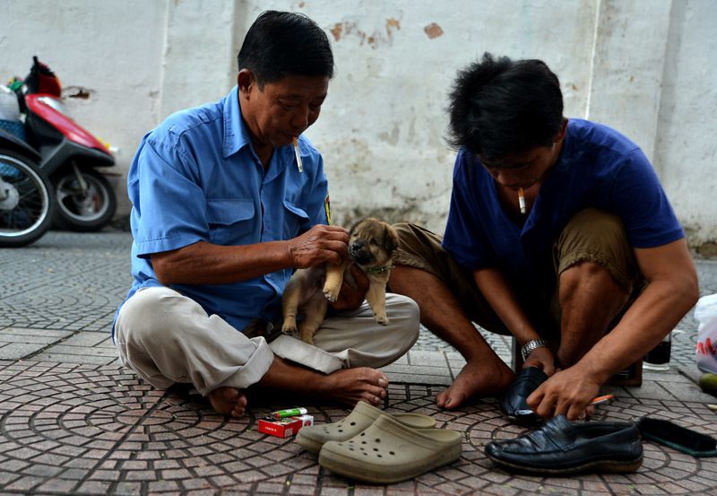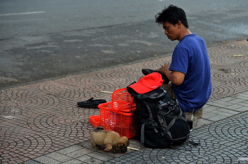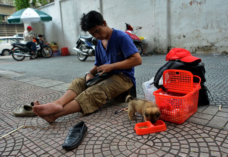 Người đàn ông bị câm làm nghề đánh giày và chú chó mù mưu sinh hàng ngày trên phố Thái Văn Lung.