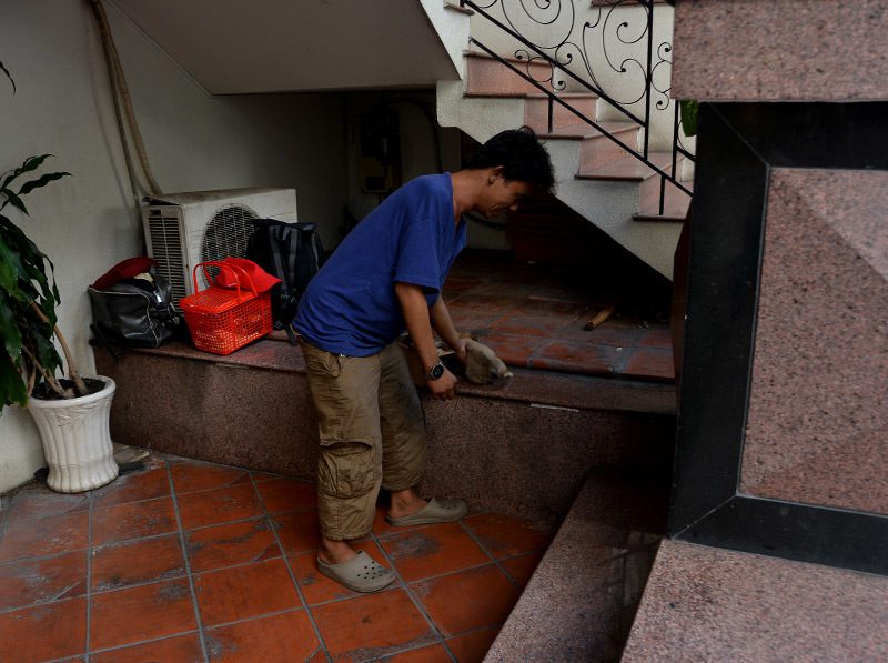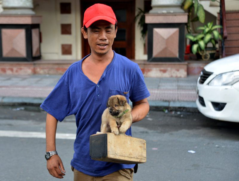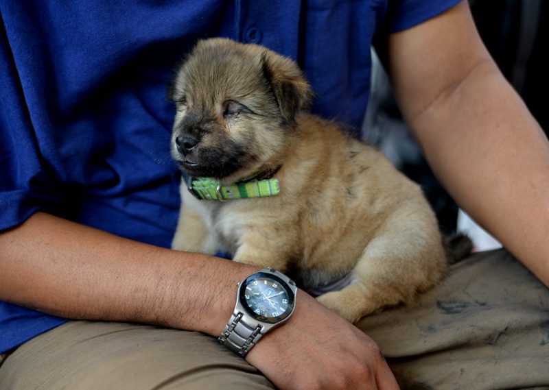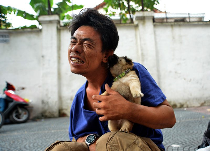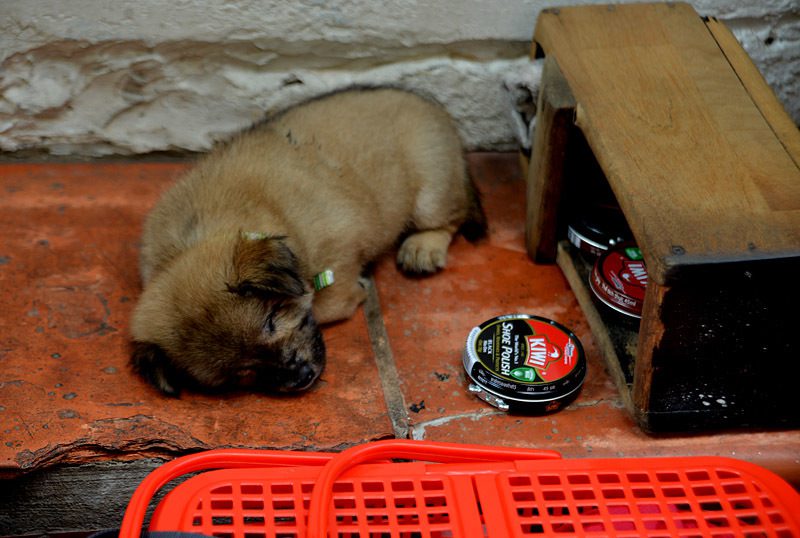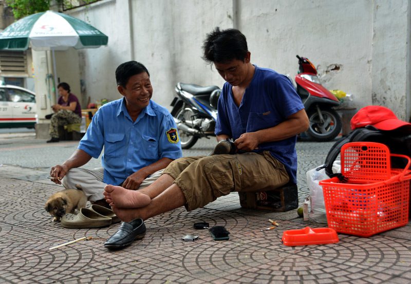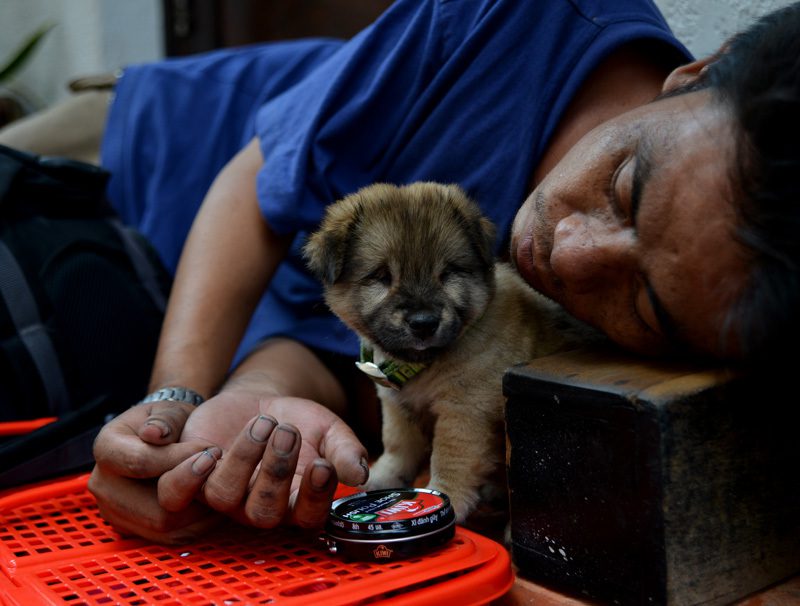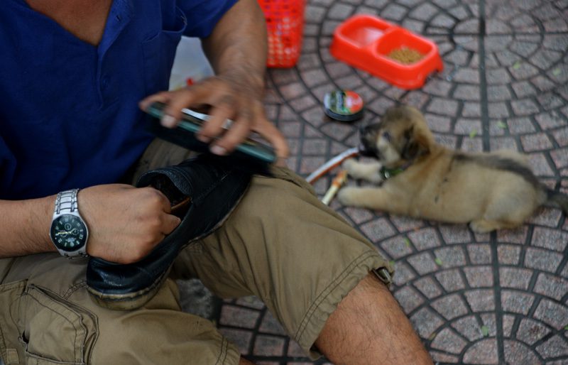 Bạn đồng hành của anh Ân là một chú chó bị mù, luôn kề bên từ lúc đi làm đến bữa ăn, giấc ngủ. Trong khi anh lặng lẽ mời khách và cặm cụi với bàn chải, hộp xi, chú chó nằm yên sát bên, thi thoảng ngẩng đầu “lắng nghe” tiếng bước chân trên vỉa hè.