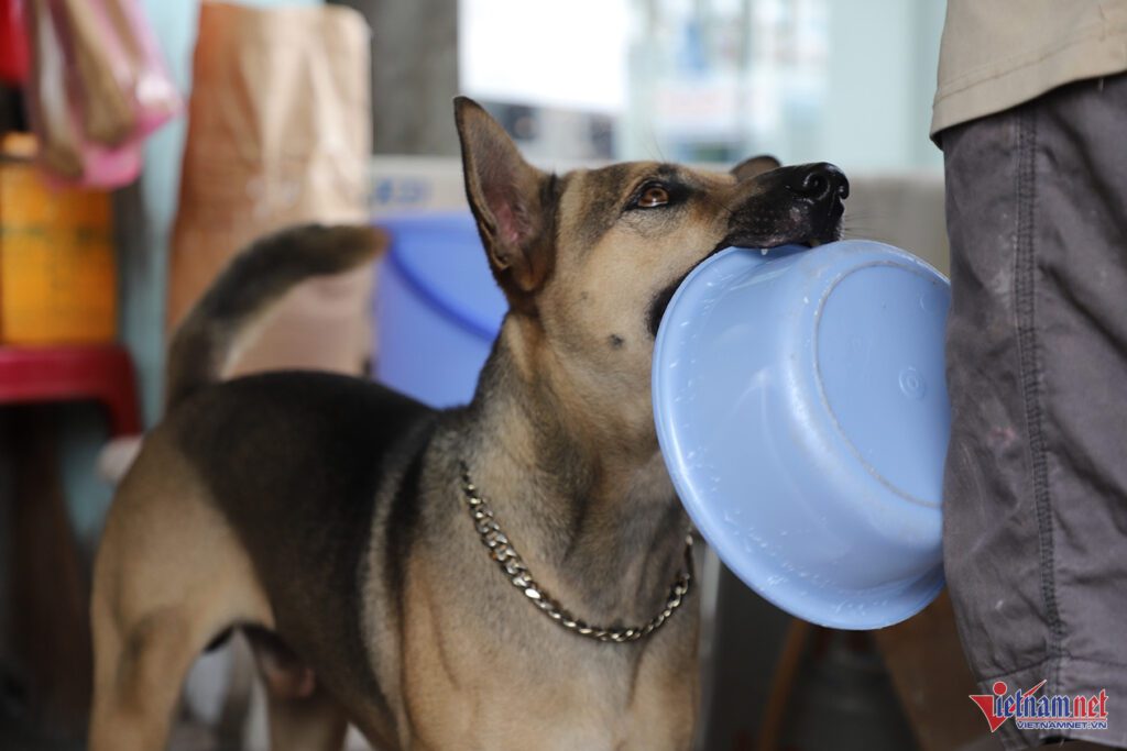 Tới quán chuối chiên, điều đầu tiên khiến thực khách thích thú không chỉ là mùi thơm của những chiếc bánh, mà còn là sự xuất hiện của “Gấu” – chú chó 4 tuổi thuộc giống chó cỏ lai becgie.