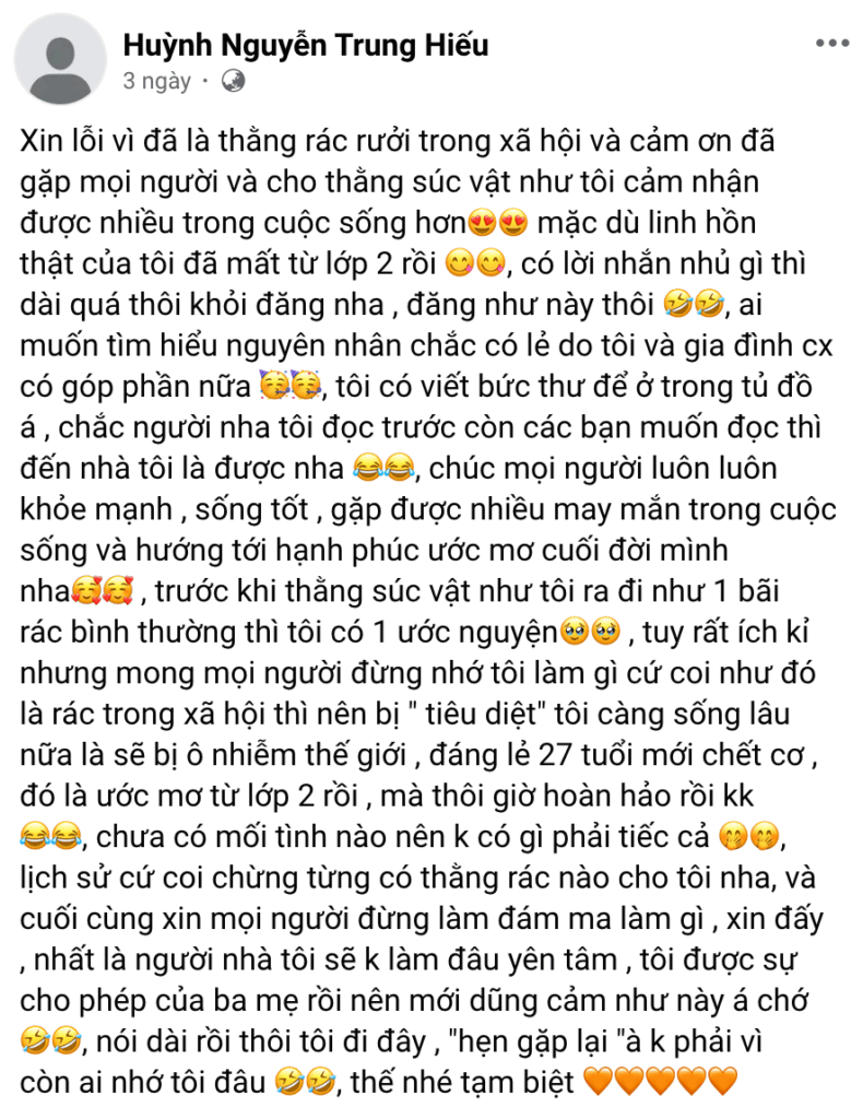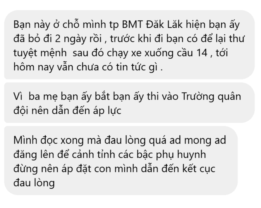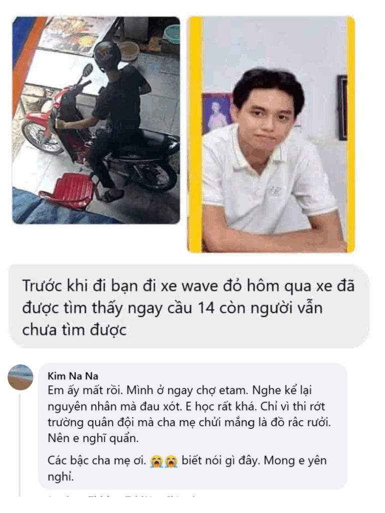 Liên quan đến vụ việc, trước đó trên một tài khoản Facebook được cho là của nam sinh này đã đăng tải status nói về ý định sẽ tìm đến cái chết. Thông tin đăng tải đã thu hút sự quan tâm của cộng đồng mạng. Nhiều ý kiến bình luận động viên nam sinh bình tĩnh, không làm điều dại dột nhưng không được phản hồi.