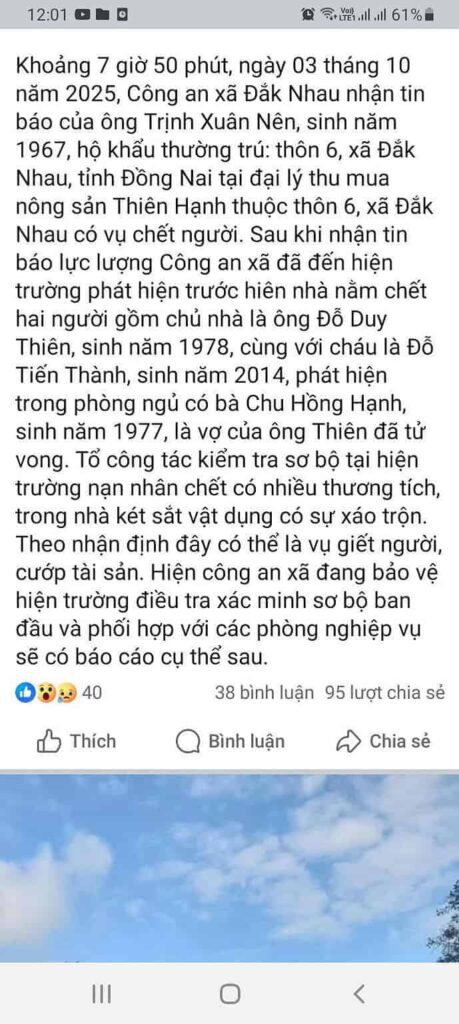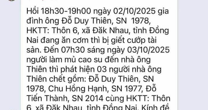 Ngày 3/10, Công an tỉnh Đồng Nai đang phối hợp cùng các đơn vị nghiệp vụ điều tra vụ án mạng đặc biệt nghiêm trọng tại thôn 6, xã Đắk Nhau, khiến ba người trong cùng một gia đình tử vong.