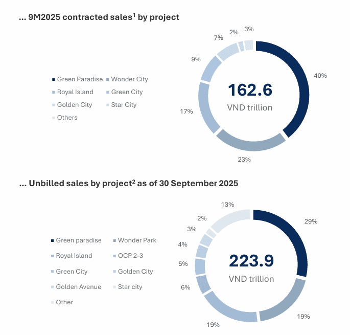 Nhìn vào tổng doanh số bán hàng hơn 162.600 tỷ đồng của Vinhomes, siêu dự án Vinhomes Green Paradise Cần Giờ chiếm 40%, tương ứng khoảng 65.000 tỷ đồng. Hai dự án tiếp theo đóng góp lớn vào doanh số là Vinhomes Wonder City và Royal Island, lần lượt chiếm 23% và 17%.