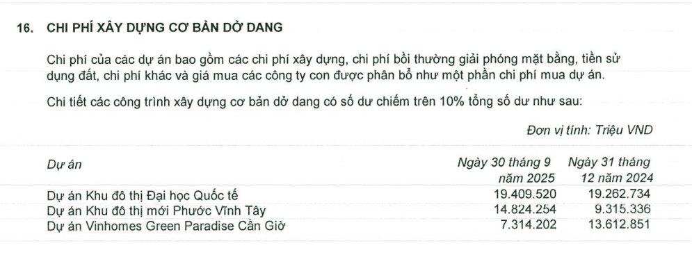 Khoản mục này chủ yếu gồm tiền sử dụng đất, chi phí giải phóng mặt bằng, chi phí xây dựng và phát triển tại một loạt dự án trọng điểm như Vinhomes Green Paradise Cần Giờ, Vinhomes Ocean Park 2, Vinhomes Ocean Park 3, Vinhomes Grand Park, cùng một số dự án khác.